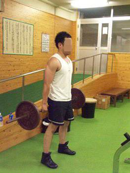 バーを床に置き足を肩幅に開きバーの前に立ちます。姿勢を保ったまま腰を落とし、肩幅でバーを握り、胸を張り背筋を伸ばします。